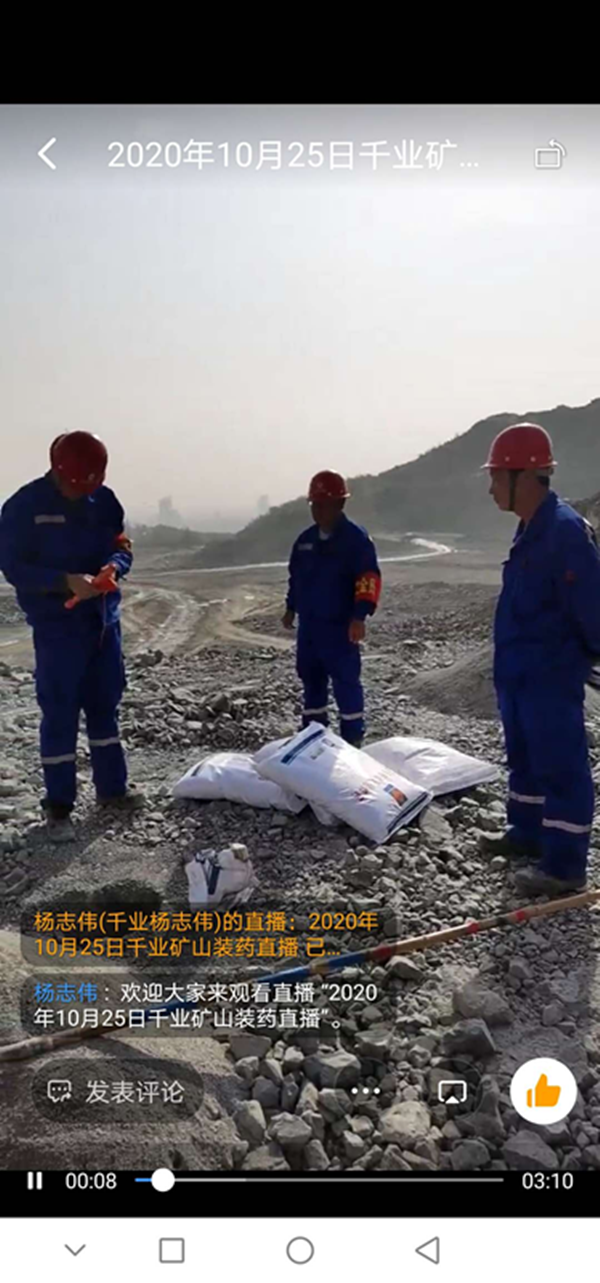近日,焦作市公安局支队领导按照河南省厅民爆未端管控全视频要求,建立了覆盖全市可视频的钉钉群,组织了焦作市辖区爆破作业人员本群,对爆破作业进行全程跟踪管理。马村分公司积极响应南省民爆末端管控全视频要求,组织爆破作业相关人员进入“焦作市爆破作业管控群”,利用将爆破现场进行直播,主要直播人员到位情况(三大员及工程技术人员是否到位)、卸车、电子雷管入库、装填、起爆等视频。 在爆破作业中,首先,现场人员全部到位,包括爆破工程技术人员1名,爆破员2名,安全员1名,保管员2名,持各自人员名片进行报到。  当运输岩石粉状大包和电子雷管的车到达作业地点后,对数量进行清点,卸车。直播开始。  下图为将电子雷管进行入库。  下图为爆破员进行装填直播。 最后,起爆直播。 马村分公司经过三天钉钉视频直播的摸索与实践,逐步建立起完整可行的直播过程,且受到市局相关领导的口头表扬。马村分公司将会一直严格按照焦作市局要求,利用钉钉直播,实现民爆末端管控全视频要求。 |