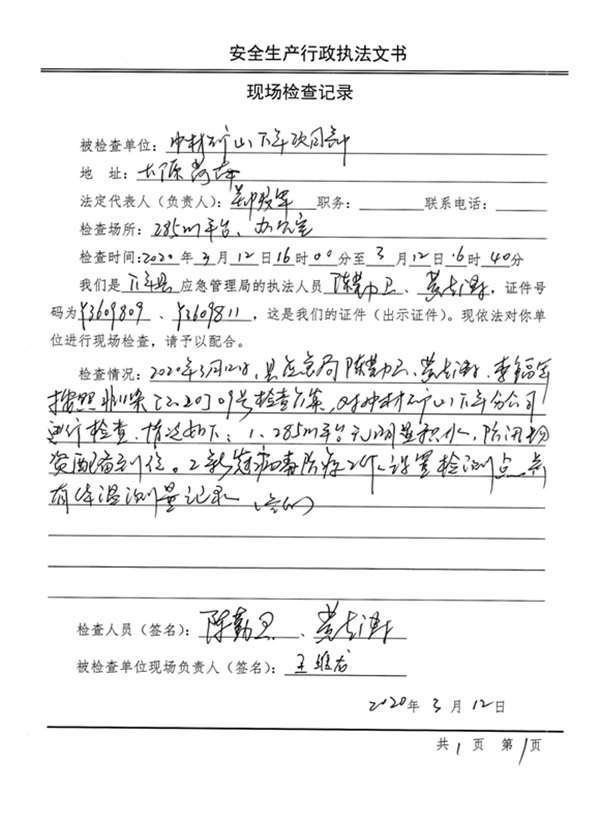 2020年3月12日下午,根据万年县疫期防控需要,万年县应急管理局领导到中材矿山万年分公司施工现场及办公室进行检查,主要检查了分公司疫情防控相关措施及汛期防护设施物资。