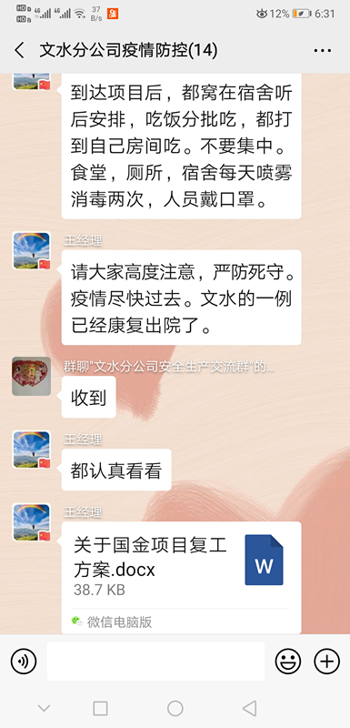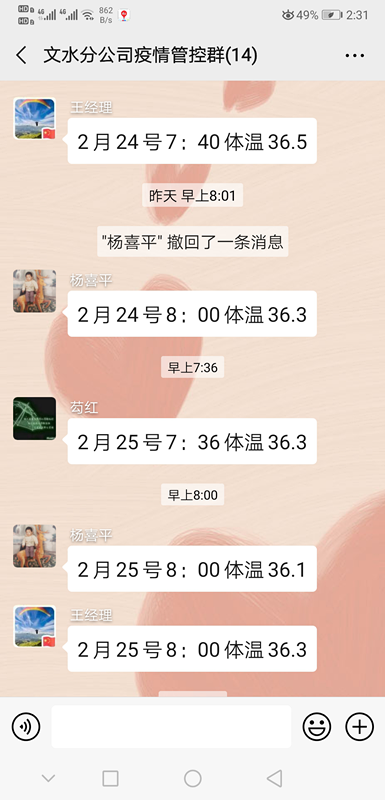 3、利用微信建群,做好公司疫情信息的搜集统计与分析工作,每日报告体温由专门负责人统计信息并报送总公司、业主、当地有关部门。