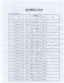 配合当地政府体温监测 落实措施,扎实开展防控工作。分公司设立疫情防控点,配备防护口罩、手套、防护镜、体温计及测温枪、酒精、84消毒液、喷雾器等防护物资。严格控制返程人员,对居住或经过疫情防控重点区域人员,要求暂不返回项目部,居家隔离自我观察;要求返回项目部人员,返程路上严格落实个人防控措施,制定记录表,对返回人员严格检查、登记;返回项目部后,在项目部内自行隔离14天,每天早晚测量体温并做好记录。    返程人员登记 每日体温监测 集中开展项目部卫生消毒工作。分公司通过多种渠道,购进酒精、84消毒液等药品,每天上午下午各进行一次集中消毒工作,办公室、会议室、厨房、餐厅、宿舍、卫生间、走廊、院内边边角角,全面消杀。  项目部消毒 消毒记录