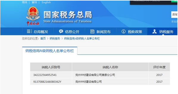 近日,税务机关组织实施的2017年度纳税信用等级评定结果“出炉”,兖州中材建设有限公司继2015、2016年度荣获A级纳税信用企业后,再次荣获A级纳税信用企业。