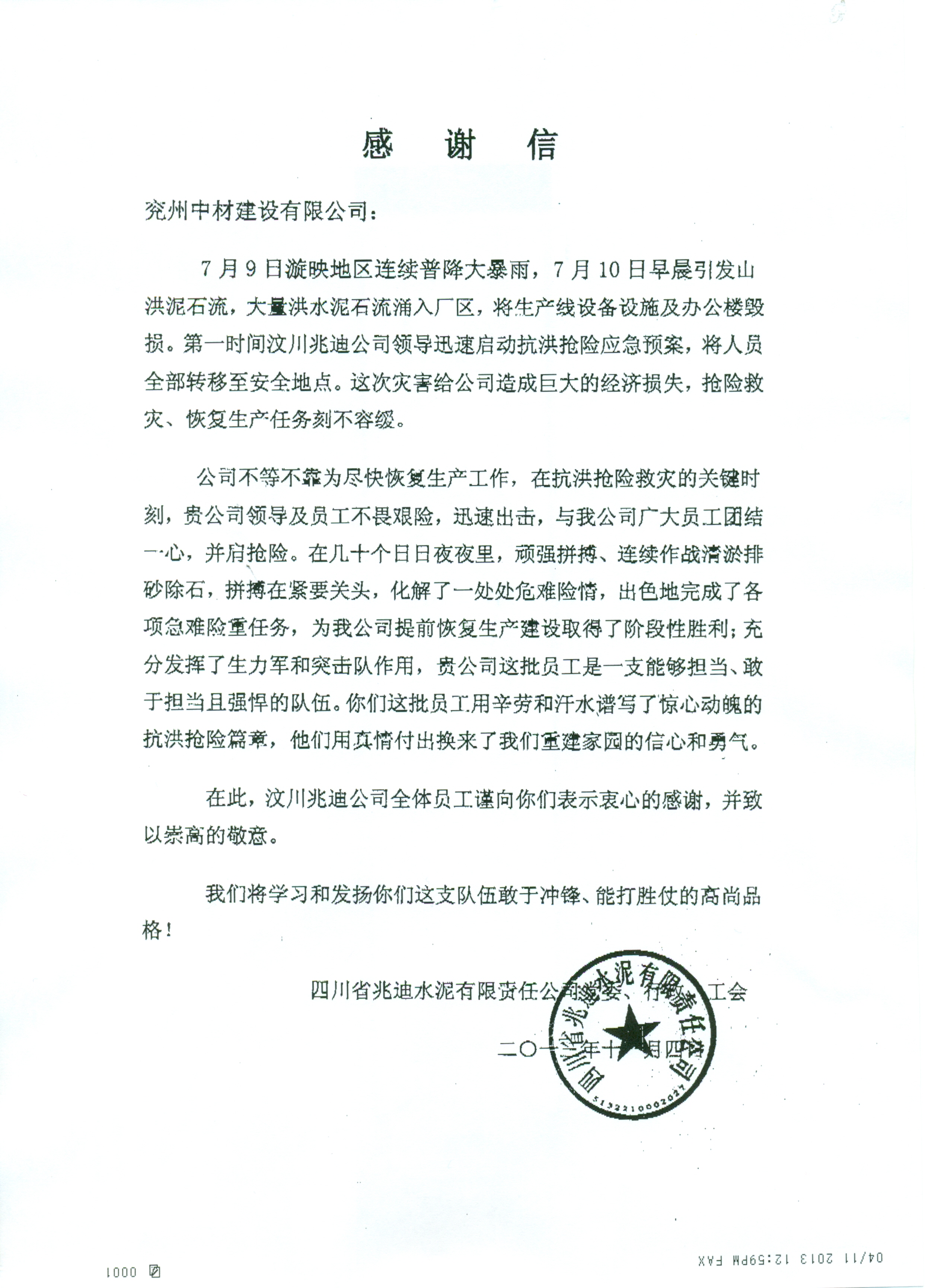 四川省兆迪水泥有限责任公司发来的感谢信!
