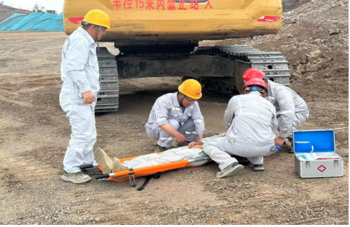 本次演练主要模拟515平台发生车辆伤害事故,一名员工被挖机回转时碰伤倒地,头部撞击受伤,伤情严重,进行紧急救援的情景。