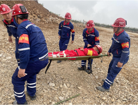 演练现场模拟遇强降雨后边坡发生垮塌事故,在接到险情报告后,应急指挥部立即启动应急预案,组织各救援小组赶赴现场
