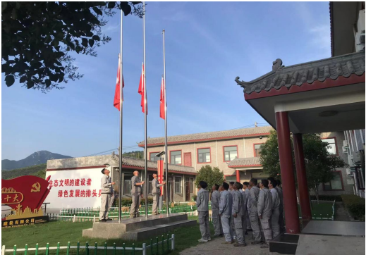 伴随着雄壮的《义勇军进行曲》,五星红旗冉冉升起,随风飘扬,全体员工齐唱国歌,向国旗行注目礼,目光凝视着迎风飘扬的五星红旗,心中寄托着对党无限的热爱、崇高的敬意以及深情的祝福。